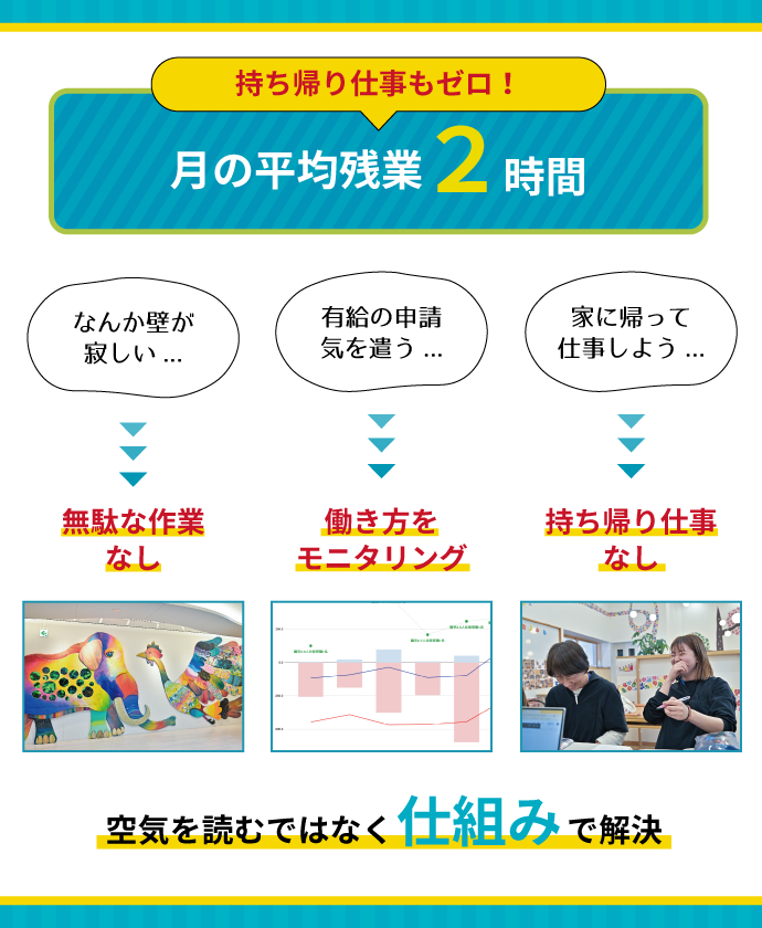 - 職員一人ひとりの勤務時間や有給の取得状況を本部がモニタリングし、園長と連携をとりながら職場の負荷のバランスを調整しています。