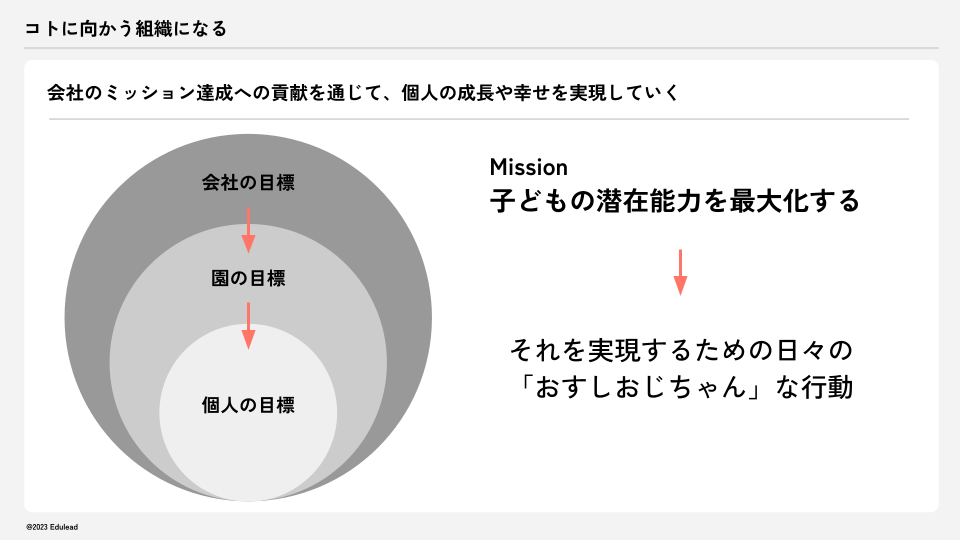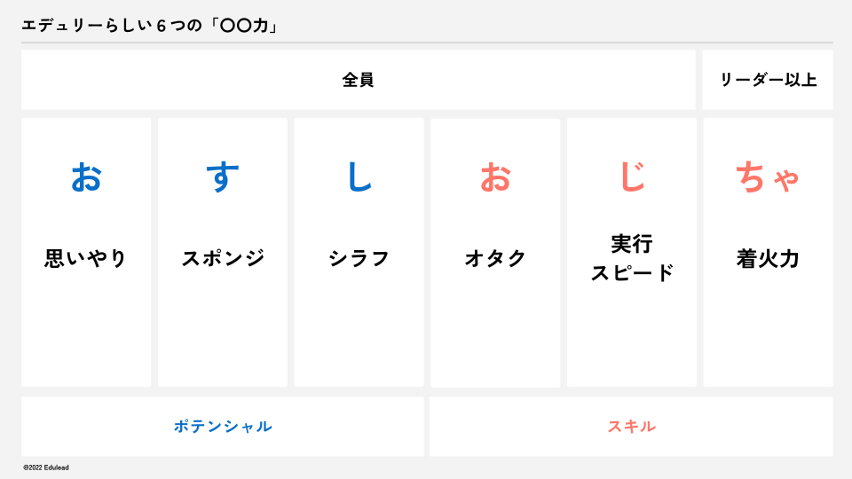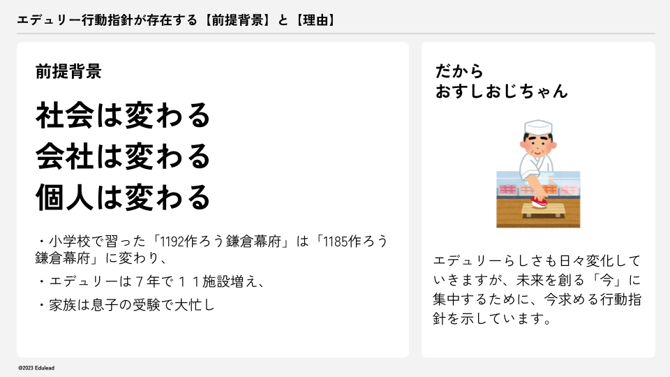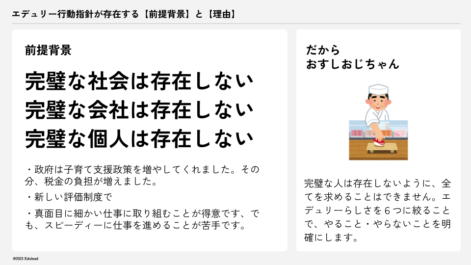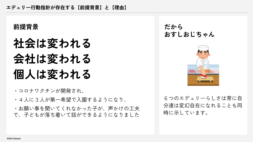 同じ目標に向かう過程で、仕事に夢中になるからこそ、時に意見をぶつけ合うこともあるはずです。そんな仲間との試行錯誤が楽しい!働きがいがある!と感じることのできるチームになるために、エデュリーでは、職員とのワークショップ・園長会での意見をもとに、6つのエデュリーらしさ”おすしおじちゃん”を設定しています。