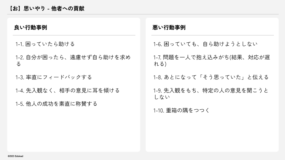 (お)思いやり:困っていたら助ける/他人の成功を素直に賞賛する力