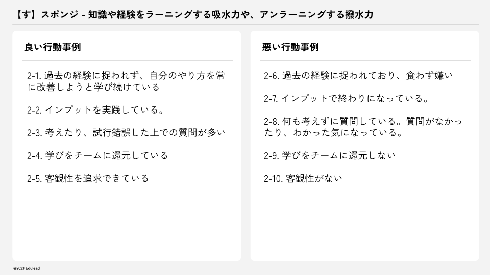 (す)スポンジ:過去の経験にとらわれず知識や経験を吸収する力