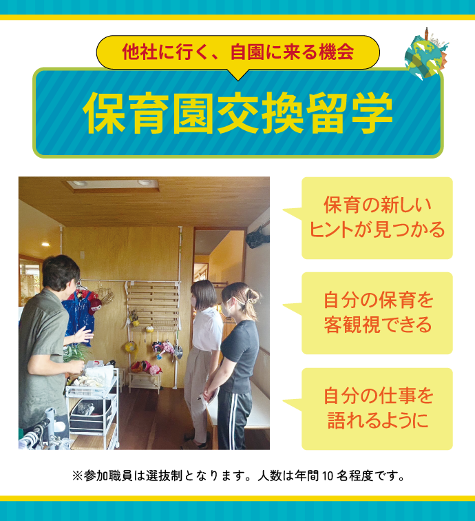 - 社長が国内外で500施設を超える園を見てきた中で、エデュリー保育のモデルとしている提携園に見学に行き、実際に保育を学ぶ機会があります。また、実際に保育園にきてもらい、研修を受けたり、自分のやっている保育を説明したり相談する機会があります。