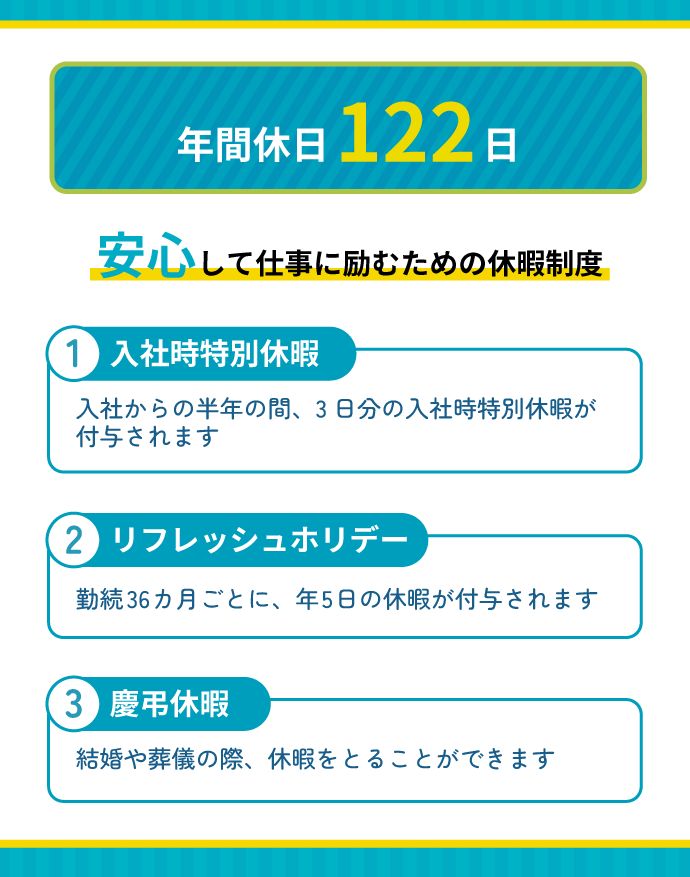 ●月の残業平均2時間 ●年間休日122日 ●3日間の入社時特別休暇 ●5日間のリフレッシュホリデー